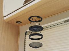 SPC-R100S-kaiuttimet voidaan asentaa helposti ylösalaisin hyllyn tai yläkaapin alapintaan matkailuauton oleskelu- tai nukkumatilassa. Mukana tulevat asennusrenkaat ovat vakiona mustat, mutta ne voidaan maalata sisustukseen sopiviksi.